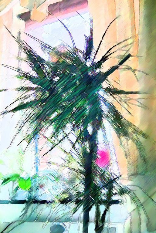 Verket skapades helt digitalt år 2016. Jag ville utforska samspelet mellan linje och färg – hur en teckning kan förvandlas till något levande när färgen tar över och börjar tala. De starka tonerna och de överlappande skikten skapar en rytm som ger bilden energi, som om den andas eller för en egen dialog mellan form och ljus.